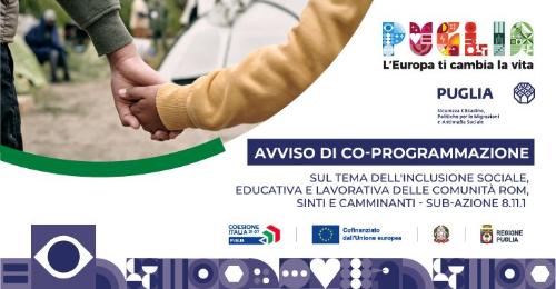 📣La Regione Puglia avvia azioni di co-programmazione dedicate alle politiche di inclusione delle comunità Rom, Sinti e Camminanti, nell’ambito del PR Puglia FESR-FSE+ 21-27 Priorità: 8. Welfare e Salute Obiettivo specifico: ESO4.10 Sub-Azione 8.11.1 “Misure volte a migliorare l’accesso ai gruppi emarginati (come i Rom) all’istruzione e all’occupazione e a promuoverne l’inclusione sociale”.