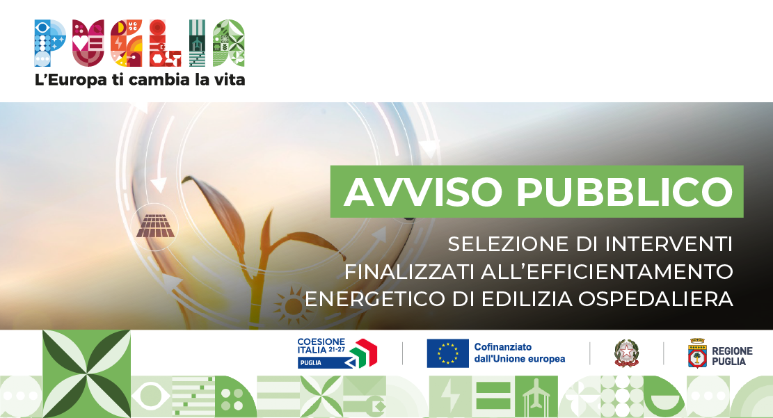 La Regione Puglia al fine di disporre di un parco immobiliare pubblico decarbonizzato e ad alta efficienza energetica, in continuità con le azioni intraprese nella Programmazione 2014-2020, intende selezionare interventi di efficientamento energetico degli edifici pubblici maggiormente energivori al fine di “Promuovere l’efficienza energetica e ridurre le emissioni di gas a effetto serra” (Obiettivo Strategico: RSO2.1). Fra gli edifici del settore pubblico, le strutture sanitarie presentano il consumo più elevato di energia per metro quadrato, sia per il consumo elettrico che per quello termico. A parità di metratura, una struttura sanitaria consuma all’anno più del doppio dell’energia di una scuola e il doppio di un edificio adibito a ufficio. L’approccio strategico dall’Avviso, promuove azioni finalizzate alla riduzione dei consumi energetici e delle emissioni di gas climalteranti, ed al miglioramento delle prestazioni tecniche ed ambientali degli edifici oggetto di intervento, attraverso interventi di efficienza energetica ed investimenti a favore delle energie rinnovabili su piccola scala per l’autoconsumo.