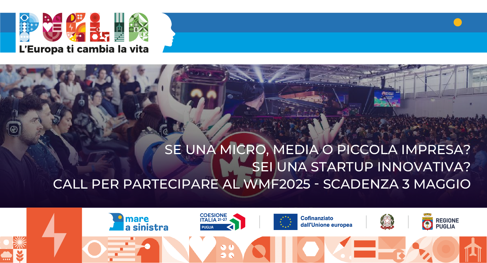 Nell’ambito delle azioni di promozione delle opportunità del Programma regionale Puglia FESR – FSE+ 2021/2027 per le imprese ad alto livello di innovazione, con particolare riferimento alla strategia #mareAsinistra, l’ARTI ha lanciato una Call per selezionare MPMI o Startup innovative pugliesi che disporranno di uno spazio personalizzato all’interno dello stand della Regione Puglia al WMF 2025.