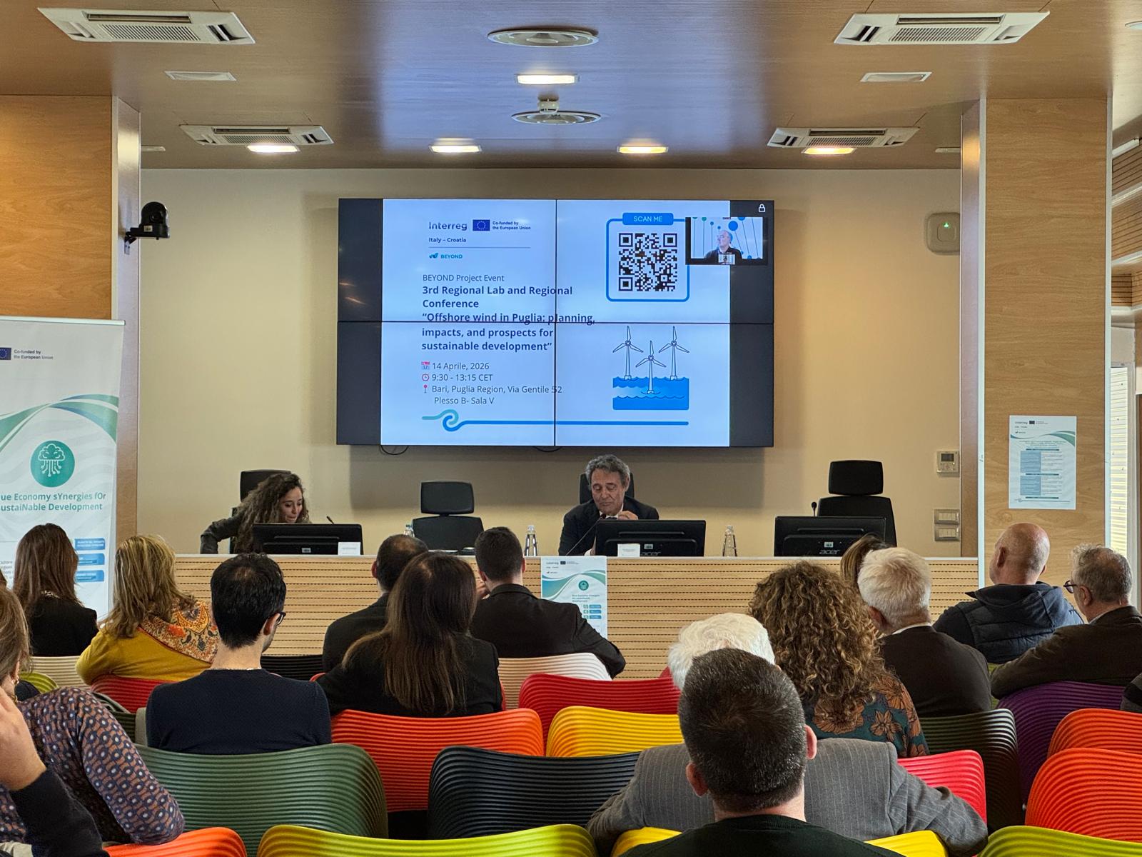 Il 14 aprile 2026 si è svolto presso la sede della Regione Puglia, in via Gentile 52 a Bari, il Terzo Regional Lab e Conferenza Regionale del progetto europeo BEYOND, dal titolo “Eolico offshore in Puglia: pianificazione, impatti e prospettive di sviluppo sostenibile”. L’evento ha rappresentato un momento operativo di confronto e co-progettazione tra istituzioni, enti di ricerca, imprese e stakeholder, con l’obiettivo di condividere analisi, strumenti e risultati del progetto, nonché di raccogliere contributi utili alla definizione di modelli sostenibili per lo sviluppo dell’eolico offshore nel bacino adriatico.
