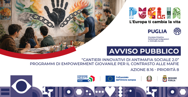 Con Determinazione n.145 del 11/12/2025 del Dirigente della Sezione Sicurezza del cittadino, Politiche per le migrazioni e Antimafia sociale, pubblicata sul Bollettino Ufficiale della Regione Puglia n. 8 del 29/01/2026, è stato adottato l’Avviso Pubblico “Cantieri Innovativi di Antimafia Sociale 2.0” per la selezione di proposte progettuali finalizzate all’affermazione sul territorio regionale, di cantieri stabili di promozione della cultura della legalità e dell’antimafia sociale.