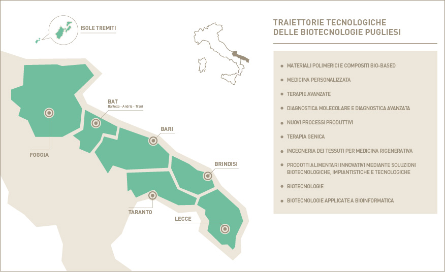 Il settore delle Biotecnologie In Puglia le biotecnologie rappresentano una realtà in forte crescita caratterizzata da un emergente sistema imprenditoriale supportato da dinamico sistema di ricerca, che ha raggiunto livelli di eccellenza sia in termini qualitativi che quantitativi. Un fiorente sistema di università, centri di ricerca, laboratori e consorzi che con le imprese stanno contribuendo a portare sviluppo e ricchezza a tutto il territorio. Le imprese biotech pugliesi, grazie anche alla presenza di due importanti multinazionali farmaceutiche, si sono specializzate in nicchie di mercato molto specifiche, in alcuni casi andando a occupare posizioni di primo piano nei mercati internazionali. Accanto a questa realtà nel territorio è cresciuto un sistema della ricerca da cui nascono progetti, spin-off e brevetti che vanno ad arricchire l’economia regionale. Gli ambiti di azione del biotech pugliese sono diversi, dalla salute ai processi industriali, ma è nella biomedicina e nella diagnostica che la ricerca e le imprese raggiungono le punte di eccellenza. Oltre alla salute dell’uomo il biotech in Puglia lavora anche per lo sviluppo di nuovi materiali e nuovi processi produttivi, per la ricerca di alimenti che siano sempre più sicuri e più buoni, la salute degli animali, la salvaguardia dell’ambiente e la bioinformatica. Gli ambiti di azione delle biotecnologie diventano impulso di sviluppo e innovazione anche negli altri settori produttivi regionali, come ad esempio l’aerospazio, la meccatronica o il settore tessile. Per il futuro del settore la Regione Puglia ha individuato alcune traiettorie biotecnologiche che rappresentano sia gli ambiti su cui puntare per lo sviluppo del settore sia lo strumento per rispondere alle sfide sociali del territorio. Si tratta di filoni di ricerca e trasferimento tecnologico funzionali a costruire un nuovo modello di sviluppo economico responsabile che sia inclusivo e sostenibile. |