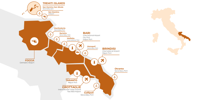 The regional airport network consists of four highly specialised airports, including two international airports in Bari and Brindisi. Both airports represent strategic hubs for air cargo, with intermodal connections to the nearby seaports in Bari and Brindisi, specialised in passenger and container traffic (RO -RO dry and liquid bulk), as well as to Bari Interport, a modern logistics infrastructure, handling freight traffic via road and railway, directed to and from northern Europe.