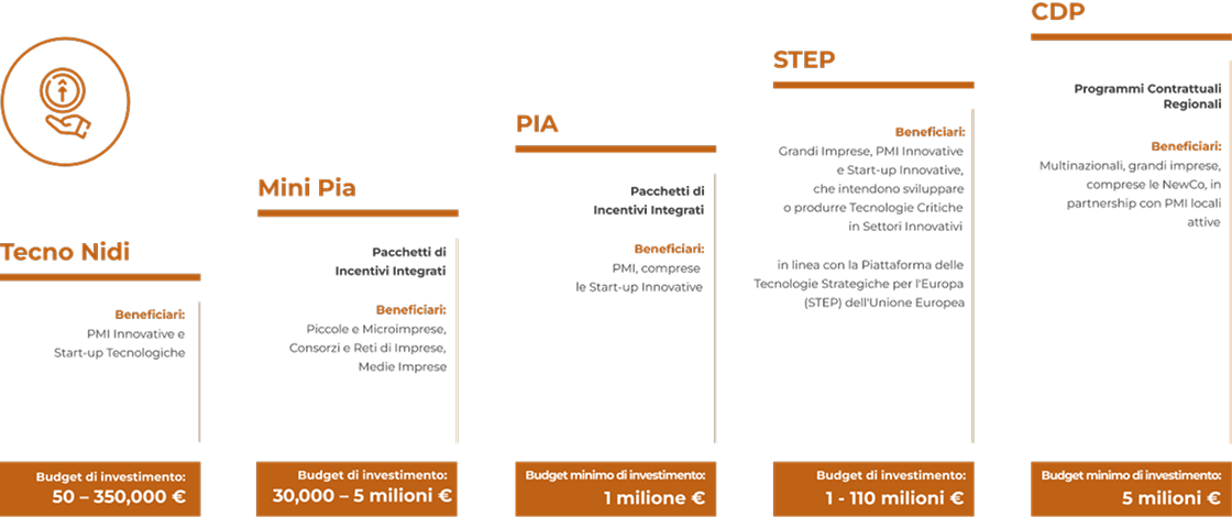 La nuova serie di incentivi regionali, nell'ambito del periodo di programmazione 2021-2027, gestiti dall'agenzia finanziaria regionale Puglia Sviluppo S.p.A., sono progettati per soddisfare le esigenze delle nuove imprese start-up, nonché delle PMI o delle multinazionali consolidate e, a seconda della natura e delle dimensioni degli investimenti proposti, offrono in genere una combinazione di aiuti finanziari e prestiti a tasso agevolato, contribuendo ad alleggerire il costo dei nuovi investimenti aziendali e rendendo disponibili finanziamenti per: