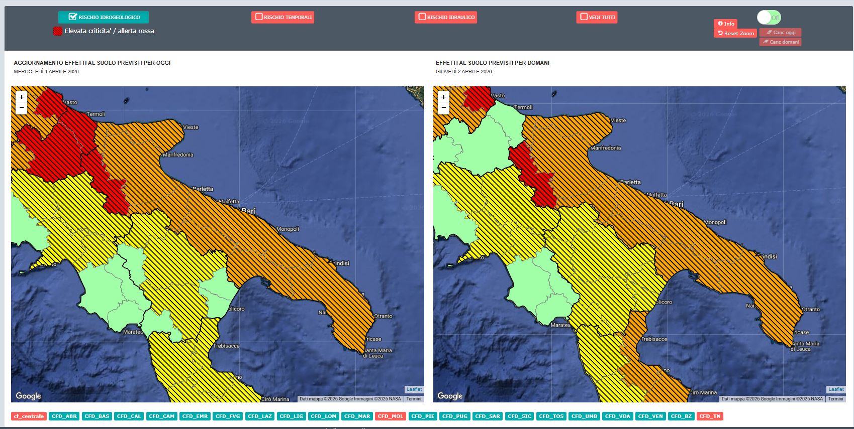 ·Per la giornata di oggi, 1 aprile, per rischio idraulico ALLERTA ROSSA su Puglia B (Tavoliere e bassi bacini del Candelaro, Cervaro e Carapelle) e Puglia I (Basso Fortore) e ALLERTA ARANCIONE su Puglia G (Basso Ofanto) e Puglia E (Bacini del Lato e del Lenne).