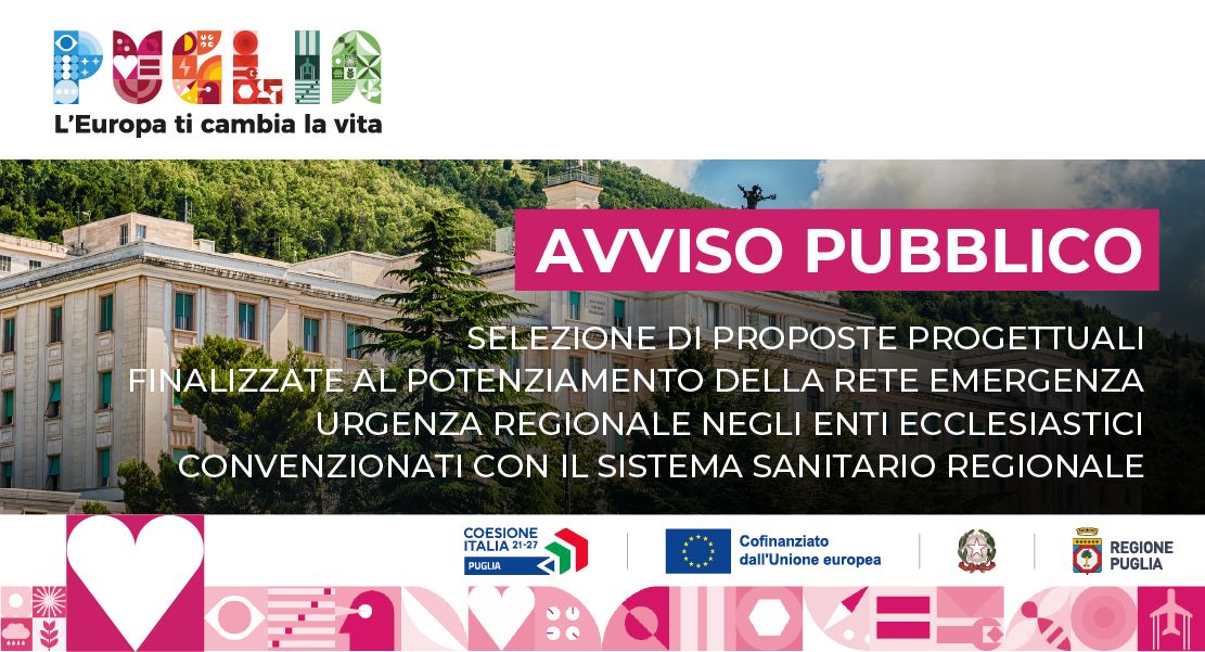 Con Determinazione del Dirigente sezione risorse strumentali e tecnologiche sanitarie 31 luglio 2024, n. 149, pubblicata sul Bollettino Ufficiale della Regione Puglia n 64 dell’8 agosto 2024, è stato pubblicato l’ “Avviso per la selezione di proposte progettuali finalizzate al potenziamento della rete emergenza - urgenza regionale negli Enti ecclesiastici convenzionati con il Sistema Sanitario Regionale”.
