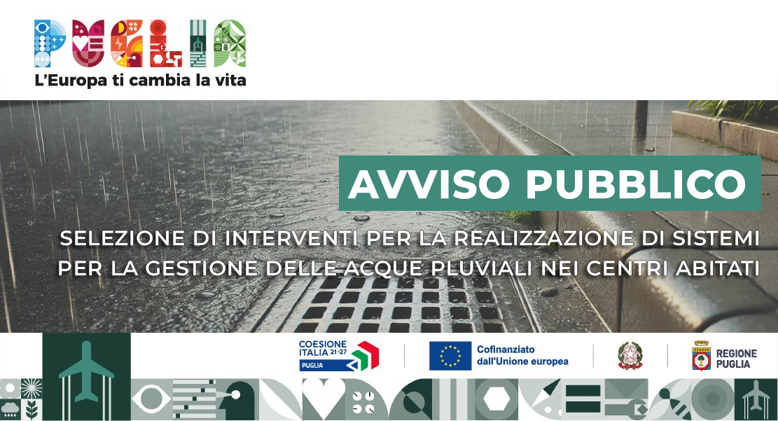 Con Determinazione del Dirigente della Sezione Opere Pubbliche e Infrastrutture n. 907 del 02/12/2024, rettificata e integrata con la successiva determinazione del Dirigente della Sezione Opere Pubbliche e Infrastrutture n. 993 del 18/12/2024, è stato approvato l’Avviso pubblico PR Puglia 2021-2027 - Asse Prioritario II “Economia verde” - Azione 2.9 “Interventi per il mantenimento e miglioramento della qualità dei corpi idrici” - sub- Azione 2.9.3 “Infrastrutture per il convogliamento e lo stoccaggio delle acque meteoriche” - Avviso pubblico per la selezione di interventi per la realizzazione di sistemi per la gestione delle acque pluviali nei centri abitati.