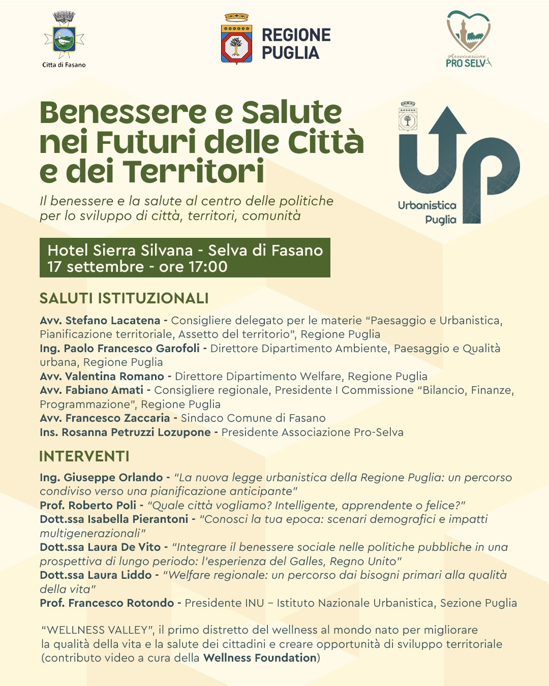 • UP01_BR: Benessere e Salute nei Futuri delle Città e dei Territori. Il benessere e la salute al centro delle politiche di sviluppo di città, territori, comunità. (Fasano, 17 settembre 2024)