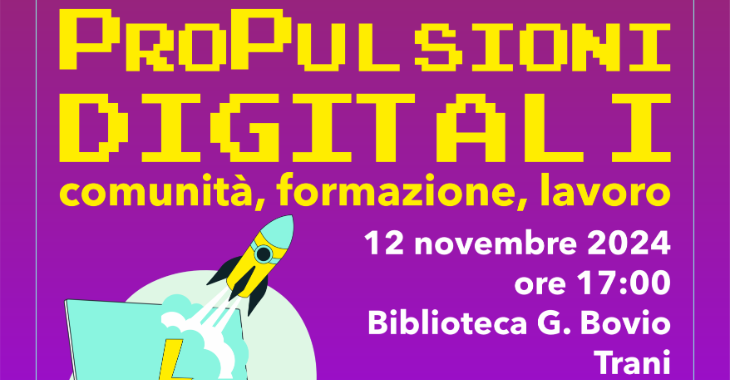 Dopo Napoli e Lamezia Terme, (PRO)Pulsioni Digitali arriva anche nella provincia della BAT, a Trani. Il progetto sarà presentato ufficialmente al pubblico con un evento di lancio che si terrà il 12 novembre 2024, dalle ore 17 alle ore 19, presso la location della Biblioteca Comunale G. Bovio.