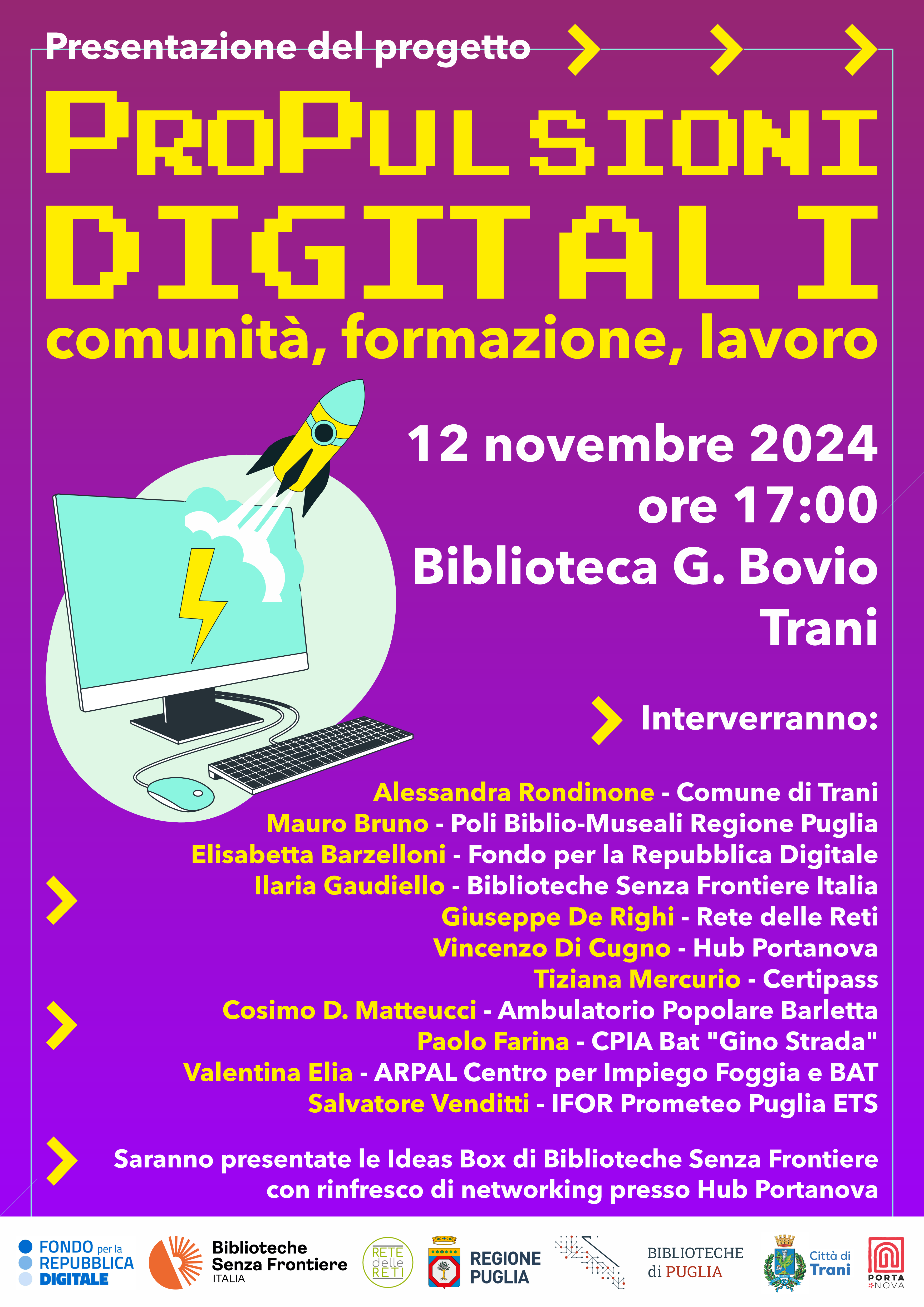 L’evento, che vedrà la partecipazione di autorità locali, enti del terzo settore e aziende, celebrando i 12 mesi di collaborazione tra Biblioteche Senza Frontiere Italia e Regione Puglia - Sistema dei Poli Biblio-Museali nell’ambito del progetto (PRO)Pulsioni Digitali: Formazione, Comunità, Lavoro, selezionato e sostenuto dal Fondo per la Repubblica Digitale – Impresa Sociale.