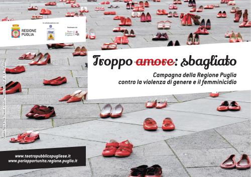 "Troppo Amore Sbagliato" è una campagna di comunicazione e sensibilizzazione che accompagna il percorso di elaborazione della legge regionale contro la violenza di genere e il femminicidio. La campagna è promossa dalla Presidenza della Giunta Regionale in collaborazione con l'Assessorato al Mediterraneo, Cultura e Turismo, l'Assessorato al Welfare, la Consigliera Regionale di Parità e il Teatro Pubblico Pugliese. (D.G.R. n.1705 del 17-09-2013)