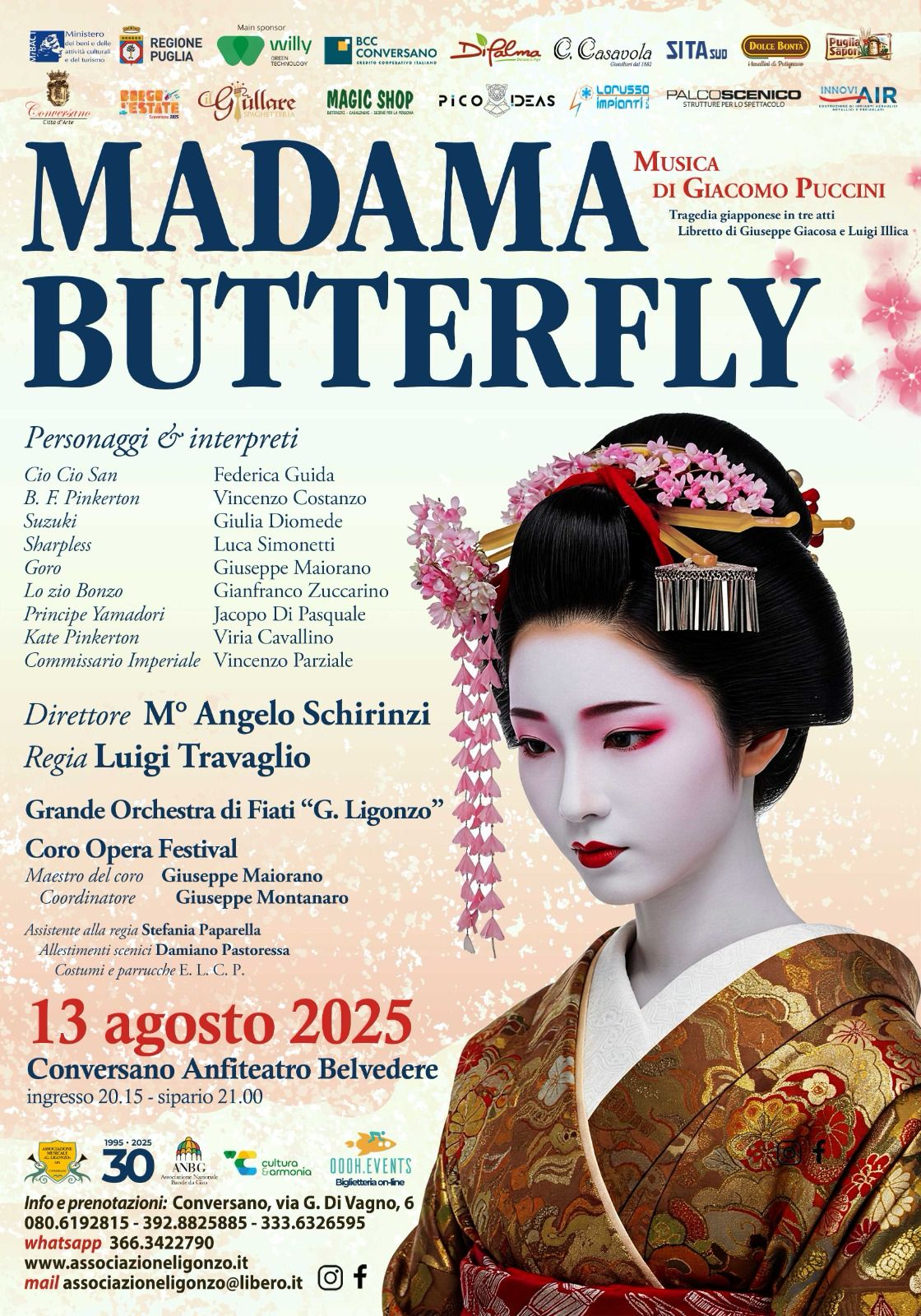 Mercoledì 13 agosto, nell'anfiteatro Belvedere di Conversano (Ba), andrà in scena Madama Butterfly di Giacomo Puccini a conclusione della XXX^ edizione del "Bandalarga Puglia Festival".