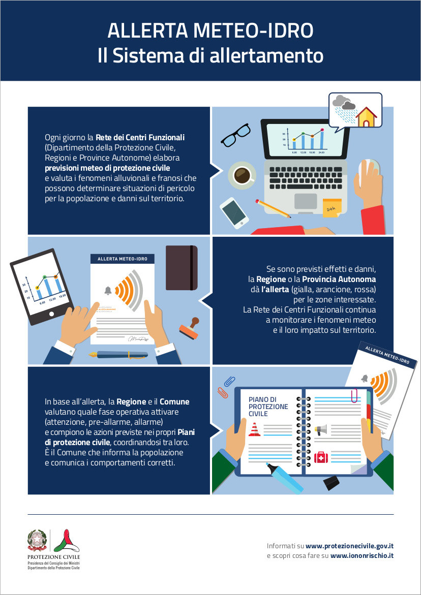 Se sono previsti eventi, il Centro Funzionale Decentrato emana un livello di allerta (gialla, arancione, rossa) per le zone interessate. A seguito dell’allertamento per il rischio meteo-idrogeologico e idraulico, ai vari livelli territoriali (Comune, Provincia, Città Metropolitana, etc.), si valutano le Fasi Operative da adottare (attenzione, pre-allame, allarme) ai fini dell’attivazione delle principali attività previste nei Piani di Protezione Civile.
