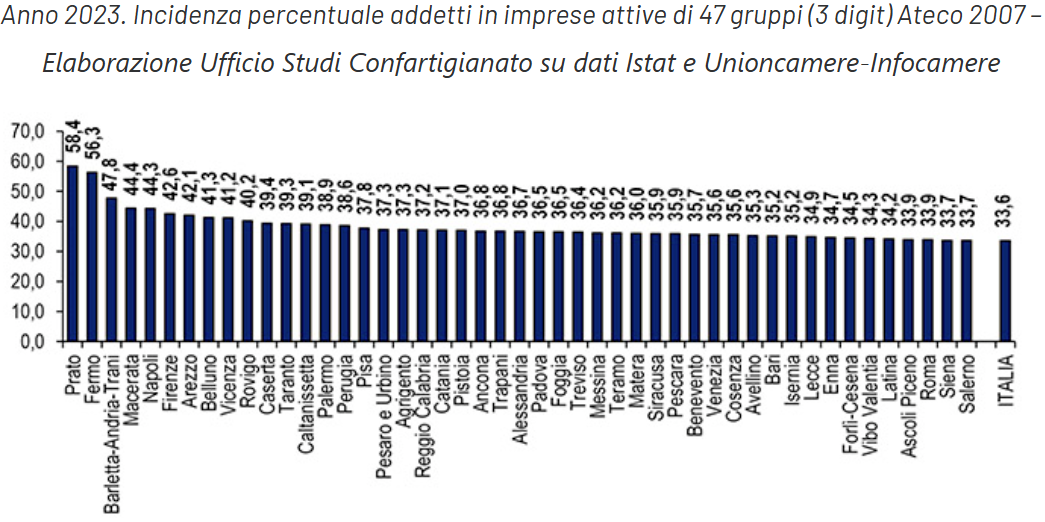 "A livello provinciale, il peso più rilevante dell’artigianato interessato dalla domanda per le festività natalizie si riscontra a Prato (58,4%), Fermo (56,3%), Barletta-Andria-Trani (47,8%), Macerata (44,4%), Napoli (44,3%), Firenze (42,6%), Arezzo (42,1%), Belluno (41,3%), Vicenza (41,2%) e Rovigo (40,2%)."