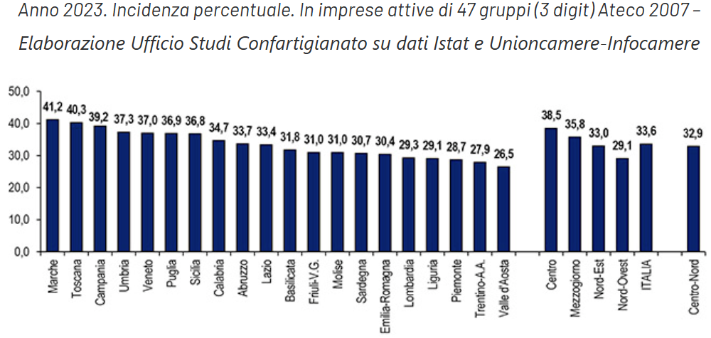 "A livello regionale si rileva un peso degli addetti nei settori di offerta di prodotti e servizi tipici del Natale sugli addetti dell’artigianato della regione superiore alla media nelle Marche con il 41,2%, in Toscana con il 40,3%, in Campania con il 39,2%, in Umbria con il 37,3%, in Veneto con il 37,0%, in Puglia con il 36,9%, in Sicilia con il 36,8%, in Calabria con il 34,7% e in Abruzzo con il 33,7%."