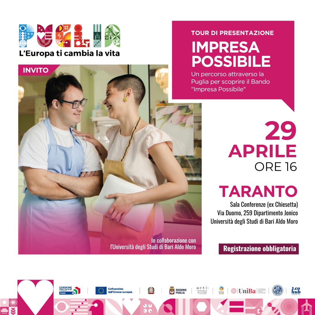 Si terrà lunedì 29 aprile alle ore 16, presso la sala Conferenze del Dipartimento Ionico dell'Università degli Studi di Bari ( ex Chiesetta) sita in via Duomo 259, la V tappa del Tour di presentazione dell'Avviso pubblico "Impresa possibile".