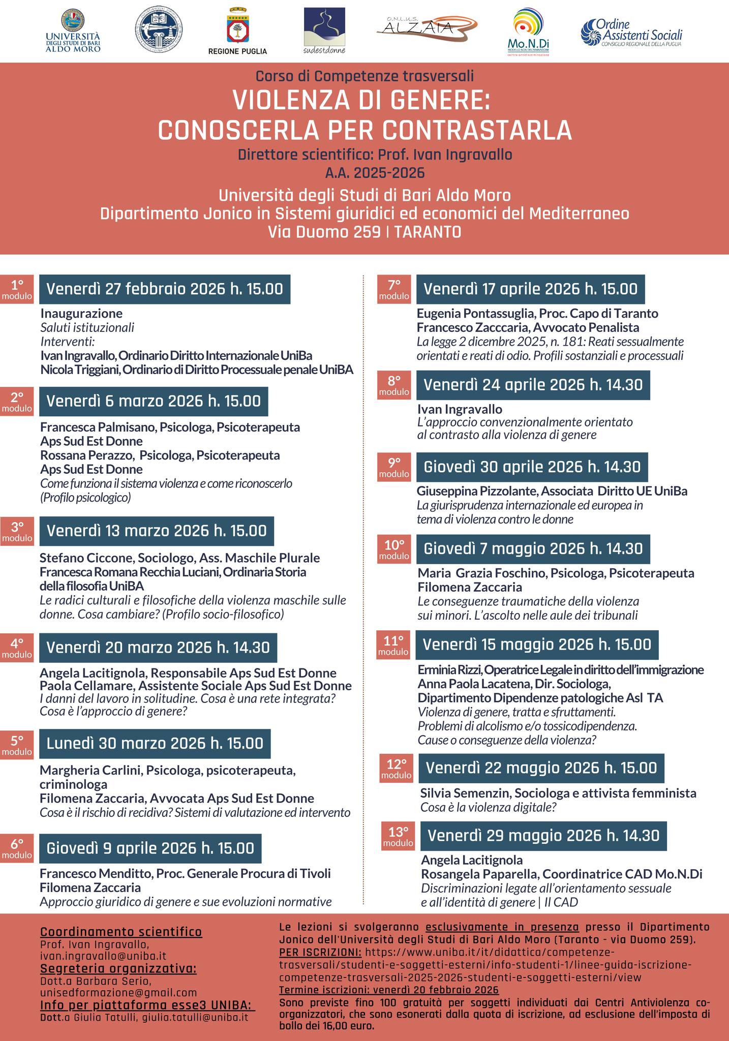 In calendario dal 27 febbraio “Violenza di genere: conoscerla per contrastarla”, corso promosso dal Dipartimento Jonico di Taranto, in collaborazione con Sud Est Donne e Alzàia Onlus.