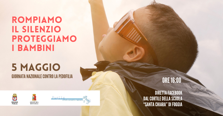 Mercoledì 5 maggio alle 16:00, in occasione della Giornata nazionale contro la pedofilia, la Regione Puglia presenta il libro Rompiamo il silenzio. Dal maltrattamento all’abuso sessuale sui minori un modo per prevenire e scoprire gli abusi, realizzato con il sostegno di Regione, Ufficio Scolastico Regionale e Questura di Foggia.