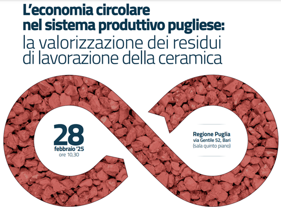 Sul tema si terrà il dibattito “L’economia circolare nel sistema produttivo Pugliese: la valorizzazione dei residui di lavorazione della ceramica” in programma il 28 febbraio 2025, a partire dalle 10.30, presso la sala conferenze sita al quinto piano del blocco B della sede regionale, in via Gentile 52, a Bari.