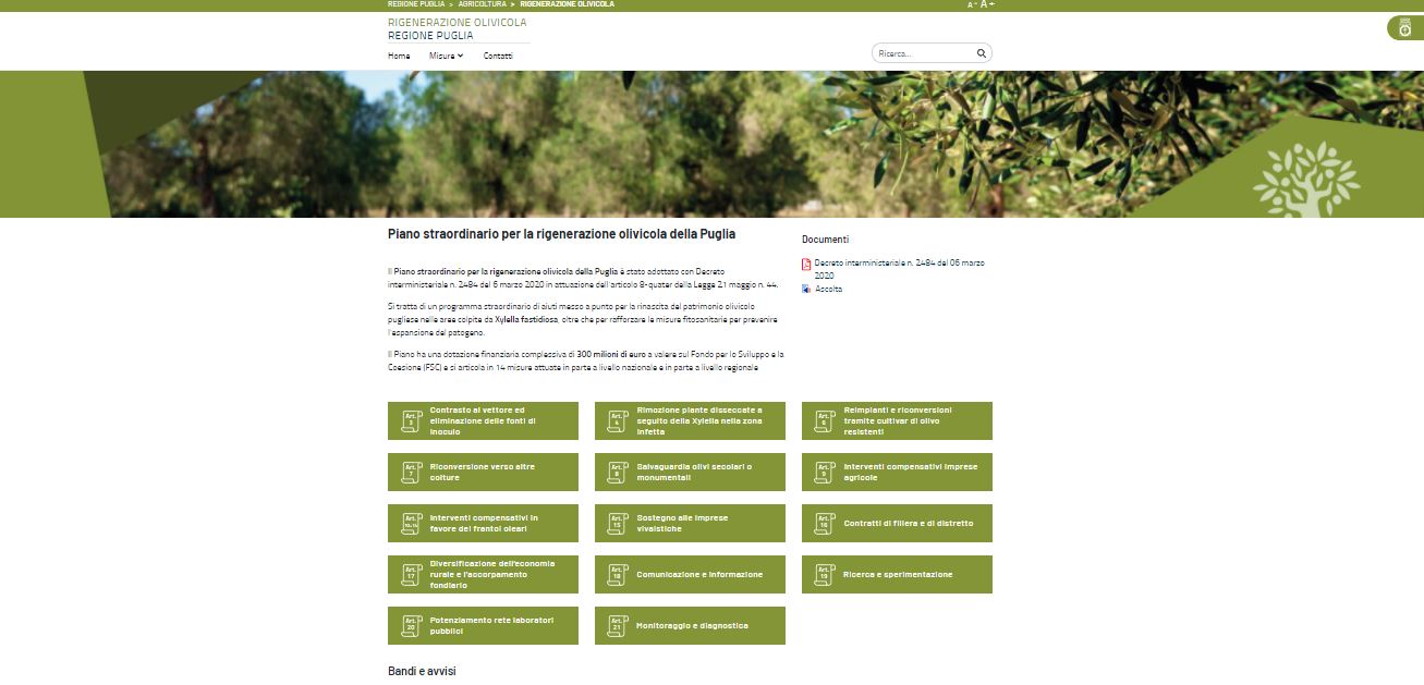 Il Dipartimento Agricoltura della Regione Puglia informa che è attivo il nuovo sito dedicato al "Piano straordinario per la rigenerazione olivicola in Puglia", il programma straordinario di aiuti, messo a punto per la rinascita del patrimonio olivicolo pugliese nelle aree colpite da Xylella fastidiosa e per rafforzare le misure di contrasto alla batteriosi.