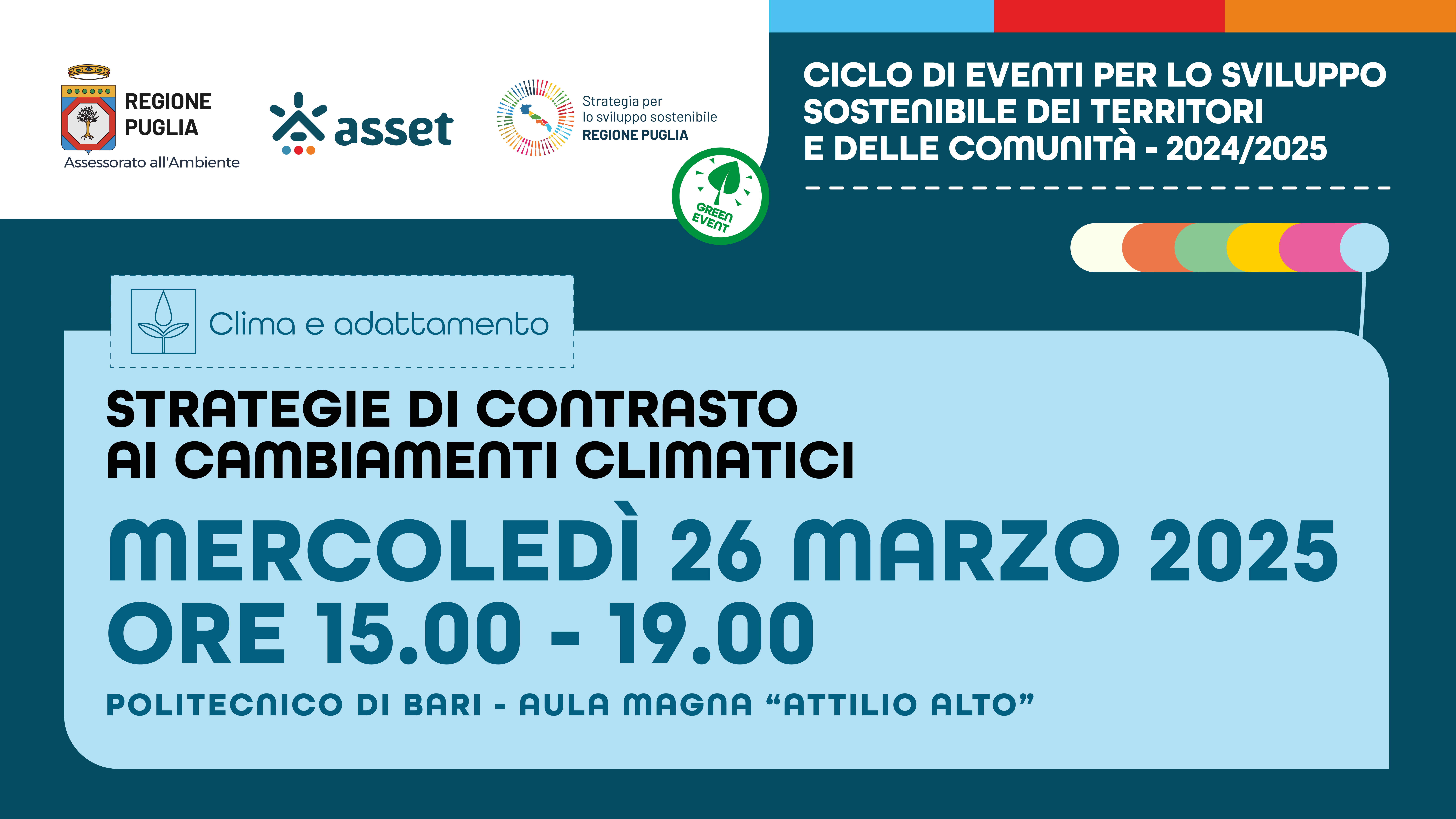 L'evento, organizzato dal Dipartimento Ambiente della Regione Puglia e da ASSET, nel contesto del ciclo di incontri "Sviluppo sostenibile dei territori e delle comunità - 2024-2025" affronterà le misure concrete per contrastare le sfide climatiche, con particolare attenzione alle risorse finanziarie disponibili per la realizzazione degli interventi.