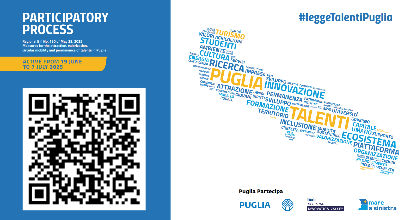 La Regione Puglia ha avviato il Processo Partecipativo relativo al Disegno di Legge n. 120, approvato dalla Giunta Regionale lo scorso 29 maggio, che mira a definire “Misure per l’attrazione, valorizzazione, mobilità circolare e permanenza dei talenti in Puglia”, in coerenza con la strategia regionale #mareAsinistra.