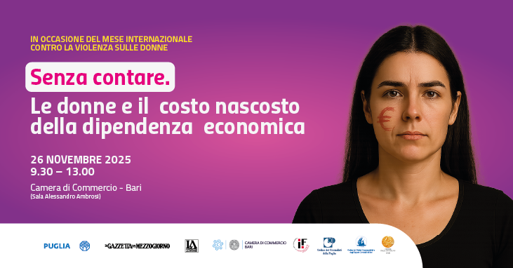 Bari si prepara a ospitare, il 26 novembre, in occasione della Giornata internazionale per l’eliminazione della violenza contro le donne, il convegno “Senza contare. Le donne e il costo nascosto della dipendenza economica”. L’evento è stato organizzato dalla Regione Puglia (Dipartimenti Sviluppo Economico e Welfare e Sezione Politiche di Genere e), con La Gazzetta del Mezzogiorno attraverso il suo mensile dedicato all’empowerment femminile La Gazzetta delle Donne, e la Camera di Commercio di Bari con il CIF (Comitato Impresa Donna).