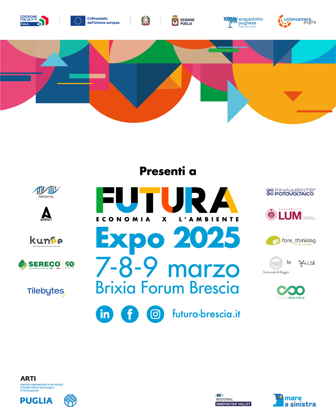 La Regione Puglia, in collaborazione con Acquedotto Pugliese, Unioncamere Puglia e ARTI, parteciperà a Futura Expo 2025 (www.futura-brescia.it), la Fiera Internazionale dedicata alla sostenibilità e all’innovazione, che si terrà a Brescia dal 7 al 9 marzo 2025.