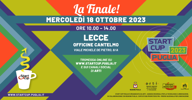 Si terrà il 18 ottobre (dalle 10.00 alle 14.00) a Lecce, alle Officine Cantelmo, la finale della Start Cup Puglia 2023, la gara tra nuove iniziative imprenditoriali innovative organizzata da ARTI - Agenzia regionale per la tecnologia e l’innovazione, in collaborazione con Regione Puglia, PNI e Comitato Promotore.