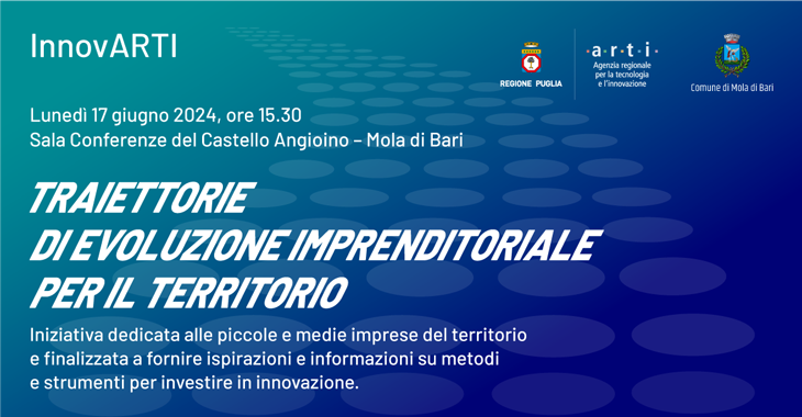 Il 17 giugno alle ore 15.30 al Castello Angioino di Mola di Bari è in programma l‘incontro Traiettorie di evoluzione imprenditoriale per il territorio, un’iniziativa di ARTI – Agenzia Regionale per la Tecnologia e l’Innovazione e del Comune di Mola di Bari, che si rivolge alle piccole e medie imprese locali con l’obiettivo di fornire informazioni su opportunità e strumenti per investire in innovazione.