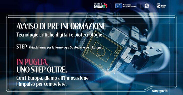 Con Delibera di Giunta Regionale n. 922 del 3 luglio 2025, pubblicata sul BURP n. 58 del 21 luglio 2025, la Giunta della Regione Puglia ha approvato la scheda di pre-informazione dell'Avvisp STEP Piattaforma per le Tecnologie Strategiche per l'Europa