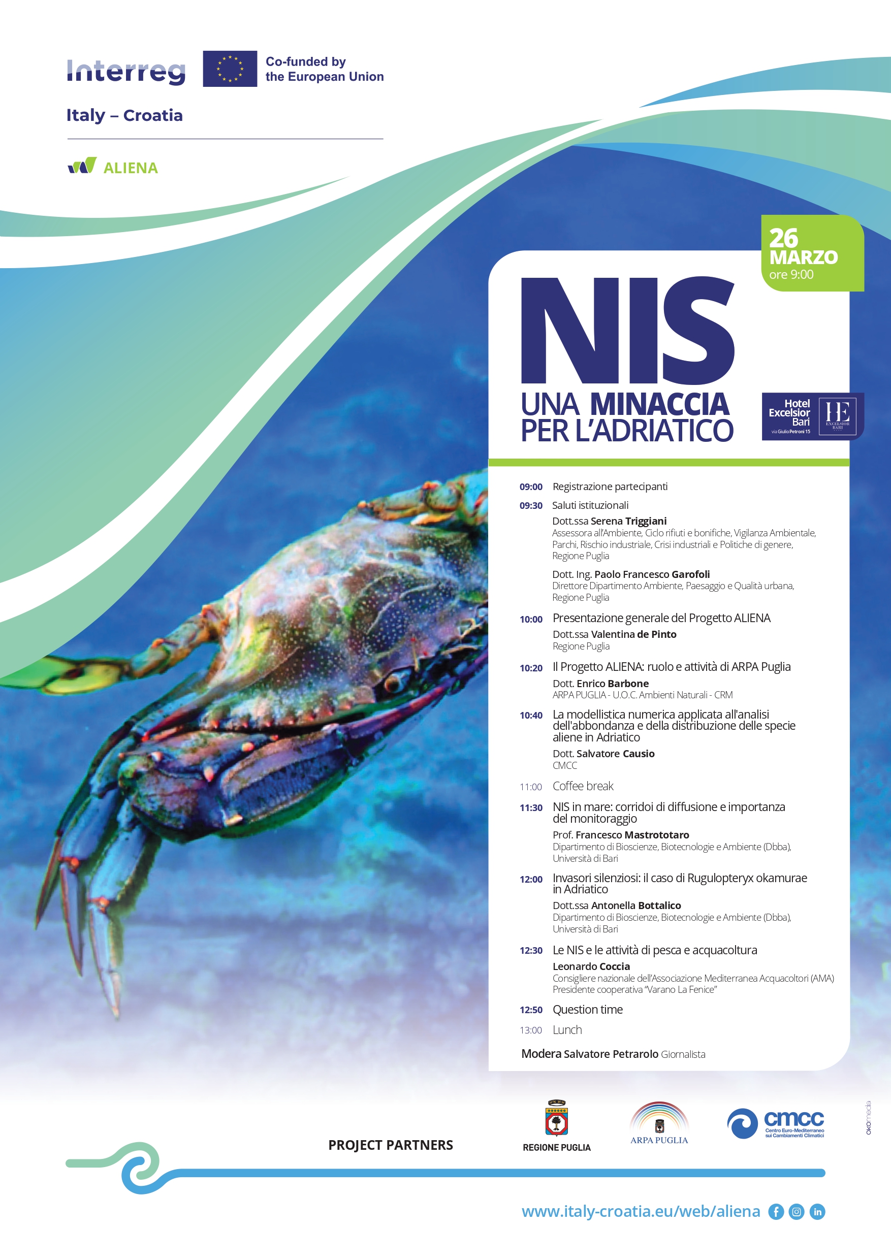 Dipartimento Ambiente, Paesaggio e Qualità Urbana della Regione Puglia. A seguire, la Dott. ssa Valentina de Pinto , in rappresentanza della Regione Puglia, presenterà il progetto ALIENA, delineandone obiettivi e strategie. Il Dott. Enrico Barbone di ARPA Puglia evidenzierà poi il ruolo dell'Agenzia all'interno del progetto, mentre il Dott. Salvatore Causio del CMCC si concentrerà sull'uso di modelli numerici nell'analisi della distribuzione delle specie aliene nel Mar Adriatico. L'evento presenterà anche le azioni concrete intraprese dal progetto ALIENA per contrastare la diffusione di queste specie.