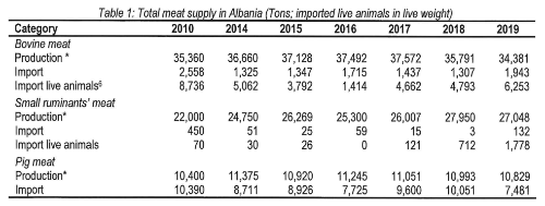 La carne e i prodotti trasformati a base di carne è uno dei settori più importanti per numero di allevatori coinvolti nel settore (oltre 240.000 allevamenti, circa il 70% del totale), articolazione e complessità della filiera merceologica. È anche uno dei settori che mostra un deficit commerciale internazionale più elevato (-91 milioni di euro nel 2019, escluse le importazioni di mangimi) e uno dei settori con il più alto impatto ambientale in fase di produzione, trasformazione e commercializzazione. Allo stesso tempo, il settore ha ancora notevoli margini di espansione, poiché il consumo di carne pro capite in Albania (39 kg pro capite/anno) è ancora ben al di sotto della media UE 27 (80,4 kg pro capite/anno).