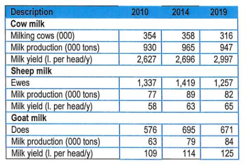 Il settore complessivo ha subito negli ultimi dieci anni un processo di razionalizzazione e consolidamento, processo ricodificato in altri settori ben; durante questo periodo. La produttività è aumentata del 13-14%, a seconda del tipo di bestiame (bovini da latte, pecore o femmine), mentre il numero di capi di bestiame da latte è leggermente diminuito (bovini da latte e pecore) o è aumentato meno che proporzionalmente (capre); la stessa tendenza è stata registrata nel settore lattiero-caseario, dove il numero di stabilimenti di trasformazione lattiero-caseari di tutte le dimensioni è diminuito da 352 a 316, ma è aumentata la produzione totale.