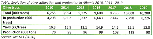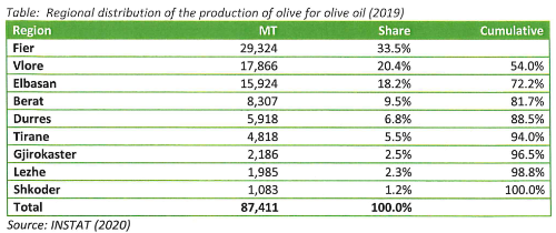 Le olive per la produzione di olio d’oliva rappresentano circa il 90% della produzione totale. Le principali zone di produzione sono Fier, Valona ed Elbasan. Le nuove piantagioni stabilite dopo il 2007 hanno spostato le principali aree di produzione orientata all’olio d’oliva che ora includono: i) un’area che comprende la parte settentrionale di Valona e l’intera regione di Fier e, ii) parti della regione di Elbasani. La costa sud-occidentale (l’area a sud di Valona) e l’area di Tirana hanno perso parte della loro importanza come core area di produzione.