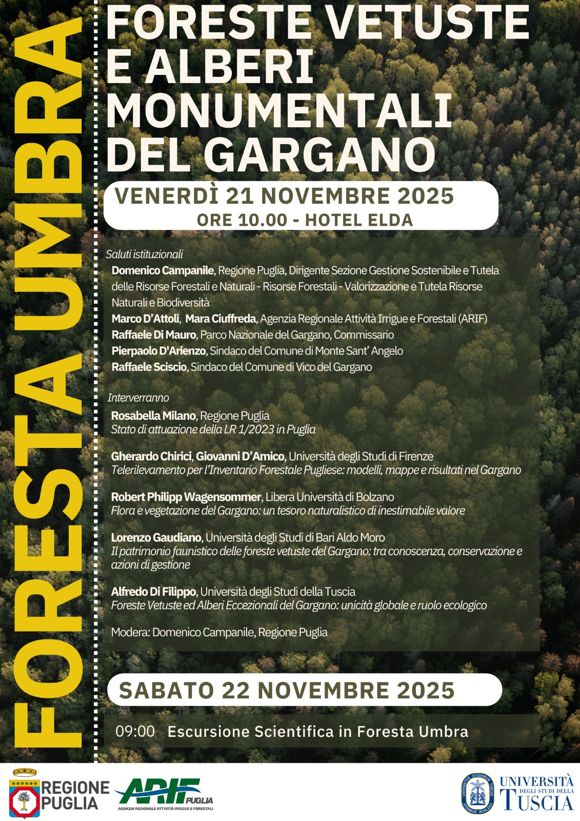 Si rende noto che il giorno venerdì 21 novembre 2025 alle ore 10:00 presso la Foresta Umbra, in agro di Monte Sant'Angelo (FG) si terrà un incontro organizzato dalla Regione Puglia in collaborazione con l'Università della Tuscia sul tema "Foreste vetuste e alberi monumentali del Gargano".