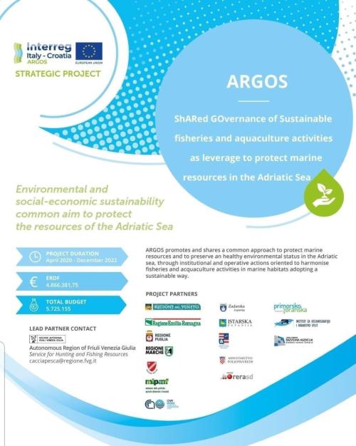 Il progetto ARGOS -“ShaARedGOvernance of Sustainablefisheries and Aquacultureactivitiesasleverage to protect marine resource in the Adriatic Sea” è stato ufficialmente approvato dall’Autorità di gestione del Programma Interreg V-A Italia - Croazia con decreto del direttore dell’unità organizzativa autorità di gestione Italia Croazia n. 97 del 29 aprile 2020.