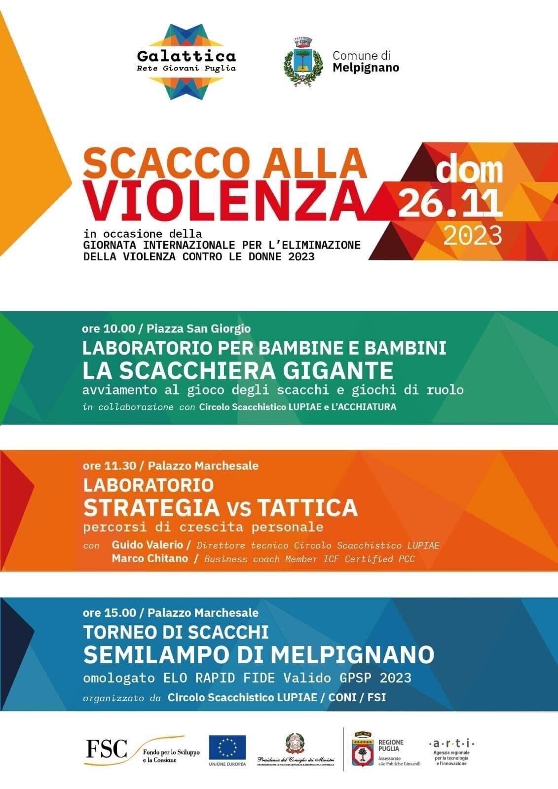 ore 10:30 “Scacco alla violenza”, laboratori interattivi attorno al gioco degli scacchi, gioco dove la regina è il pezzo più prezioso, e presentazione del percorso di crescita personale.