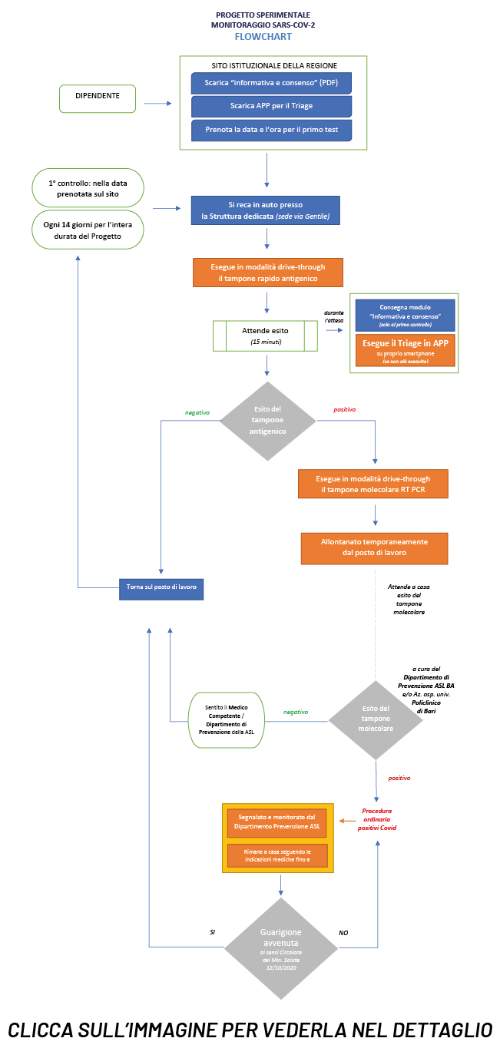 A tal fine, per garantire la massima tutela della salute delle lavoratrici e dei lavoratori e la sicurezza dei luoghi di lavoro, è possibile registrarsi per partecipare, su base volontaria, al progetto “Sistemi tecnologici integrati ai test diagnostici per il contenimento dell’epidemia da SARS-CoV-2” che prevede un’attività di screening dei lavoratori attraverso l’esecuzione diagnostica con test per l’indagine dell’infezione e del Triage quotidiano online.