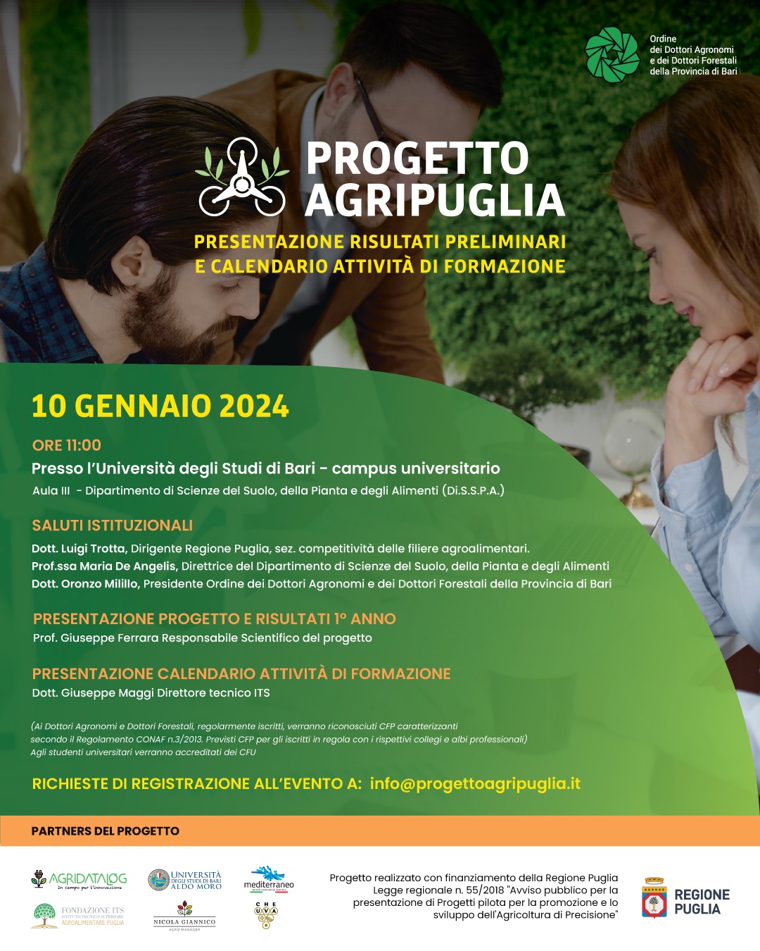 L’evento avrà lo scopo di illustrare i risultati preliminari del progetto, realizzato con finanziamento della Regione Puglia - Legge regionale n.55/2018 “Avviso pubblico per la presentazione di Progetti pilota per la promozione e lo sviluppo dell’Agricoltura di Precisione, durante il primo anno di attività e di presentare il calendario delle future attività di formazione a cui sarà possibile iscriversi fino al 25 gennaio 2024.