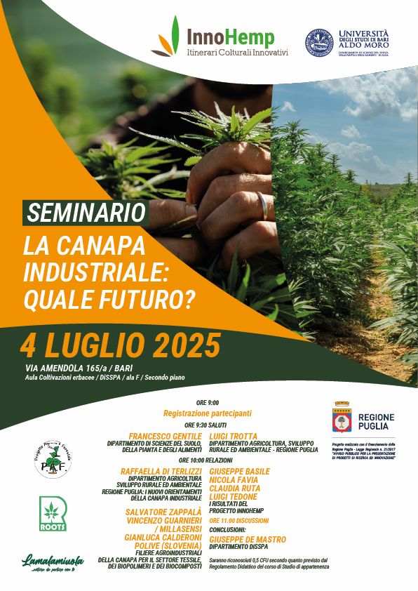 Venerdì 4 luglio si terrà presso l’Aula Coltivazioni Erbacee del Dipartimento di Scienze del Suolo, della Pianta e degli Alimenti (DiSSPA) dell’Università di Bari un seminario dal titolo “La canapa industriale: quale futuro”, in collaborazione con la Regione Puglia, le associazioni canapicole e gli studenti della Facoltà.