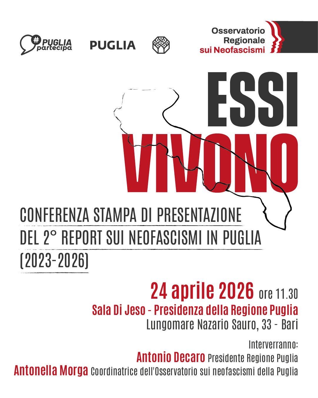 Domani, venerdì 24 Aprile, alle ore 11,30, presso la sala De Jeso, nella sede della presidenza della Regione Puglia, il presidente della Regione Puglia, Antonio Decaro, e la presidente dell’Osservatorio sui neofascismi in Puglia Antonella Morga, presenteranno il secondo report (dopo quello licenziato nel gennaio 2024) predisposto dall'Osservatorio regionale sui neofascismi.