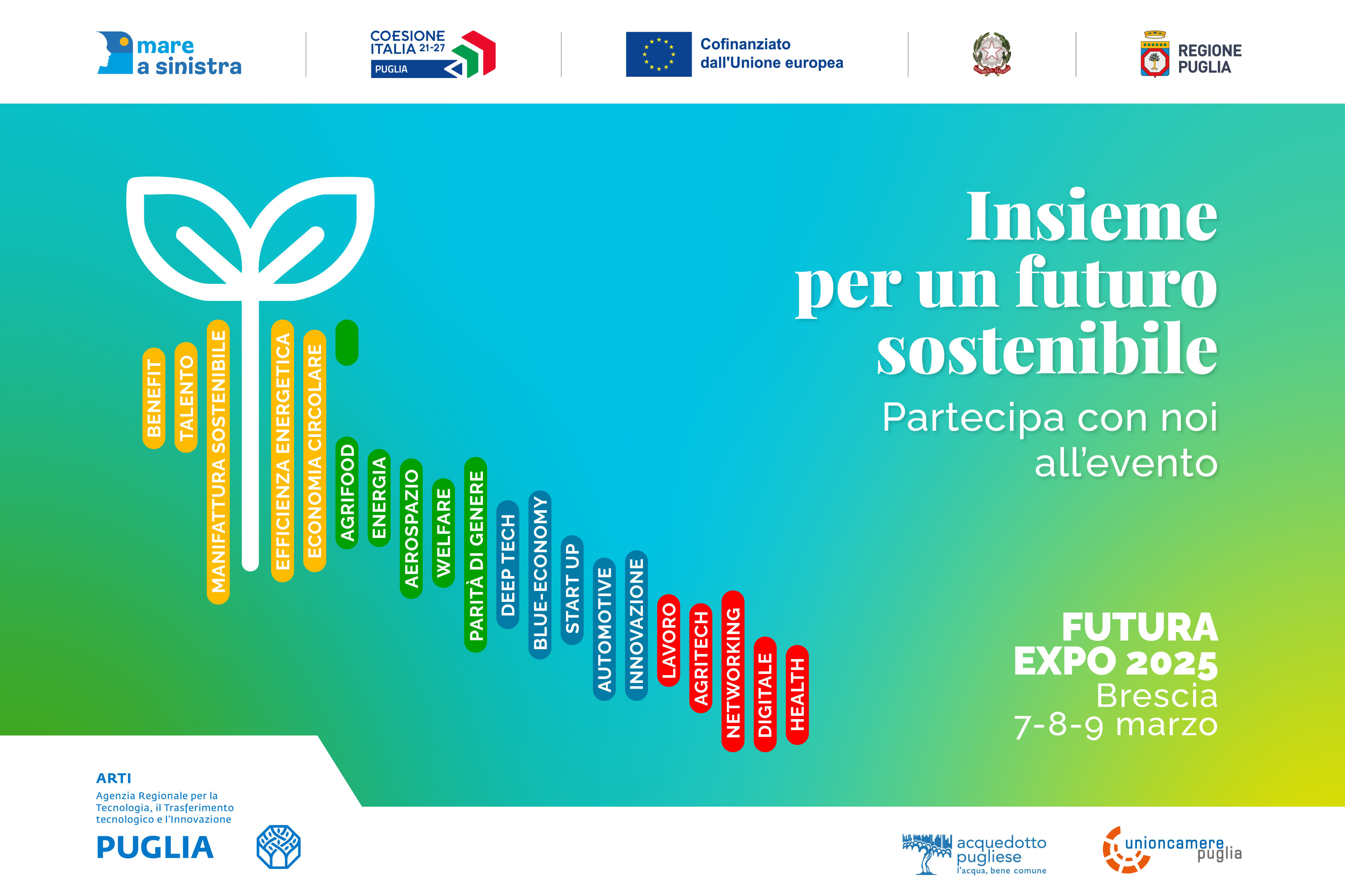 La Regione Puglia, in collaborazione con Acquedotto Pugliese e Unioncamere Puglia, sarà presente a Futura Expo 2025, la Fiera Internazionale dedicata alla sostenibilità e all’innovazione, che si terrà a Brescia dal 7 al 9 marzo 2025.