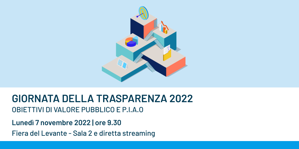 Nella giornata del 7 novembre, presso la Sala 2 della Fiera del Levante di Bari, si svolgeranno i lavori dell’annuale Giornata della Trasparenza, che per l’anno 2022 è dedicata al tema “Obiettivi di valore pubblico e Piano Integrato di Attività e Organizzazione (PIAO)”.