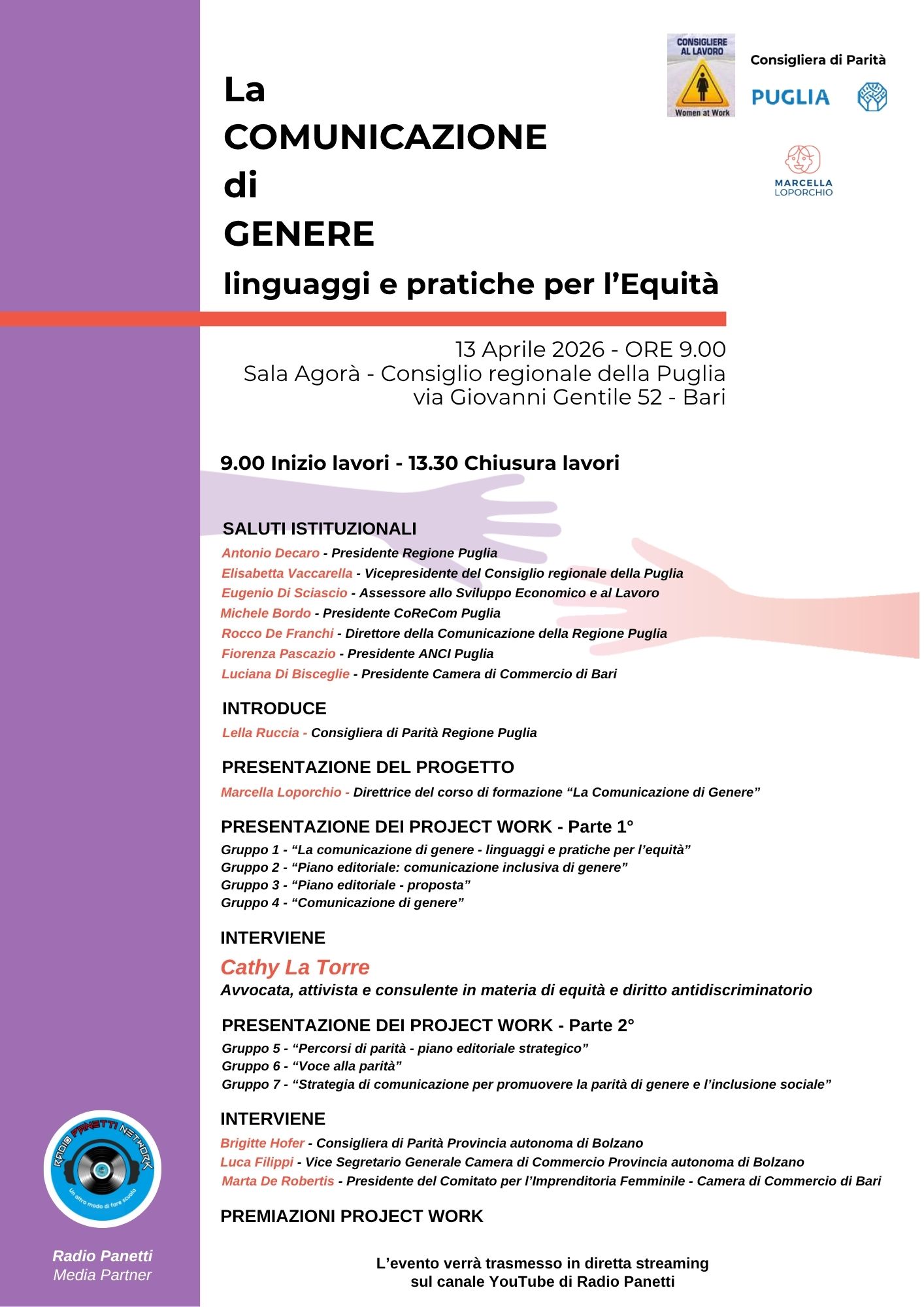 Lunedì 13 aprile 2026 alle ore 9.00 nel Palazzo della Regione Puglia in Via G. Gentile 52 a Bari, si terrà l'evento finale del corso per l’equità nella comunicazione, realizzato dalla Consigliera di parità della Regione Puglia Lella Ruccia con la direzione scientifica di Marcella Loporchio, contro l’invisibilizzazione di genere e l’utilizzo sessista del linguaggio.