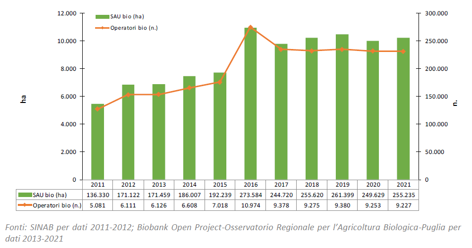 Nel panorama nazionale descritto dai dati del Sistema d'informazione nazionale sull'agricoltura biologica, Sinab, aggiornati al 31 dicembre 2020, la Puglia occupa il secondo posto in termini di superfici biologiche certificate e il terzo per numero di operatori.