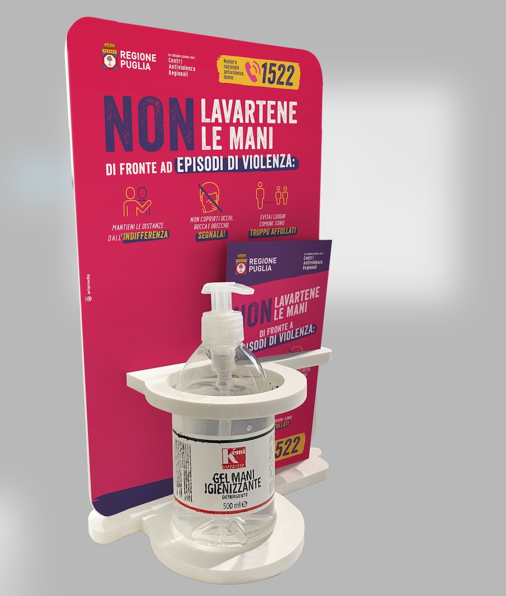 - porta dispenser con gel igienizzante con il claim “Non lavartene le mani”;
