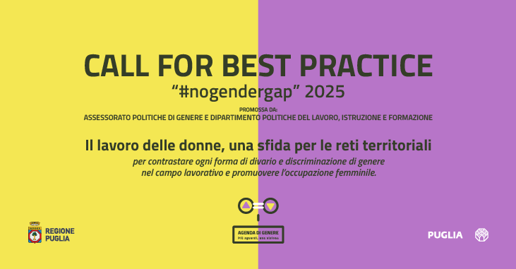 L’Assessorato alle Politiche di Genere e il Dipartimento Politiche del Lavoro, Istruzione, Formazione della Regione Puglia hanno attivato la CALL FOR BEST PRACTICE “#nogendergap” 2025 con l’obiettivo di raccogliere e valorizzare le migliori pratiche messe in atto per contrastare il divario e la discriminazione di genere nel campo lavorativo e promuovere l’occupazione femminile, favorendo e promuovendo le competenze e le potenzialità delle donne in termini di innovazione, formazione e lavoro.