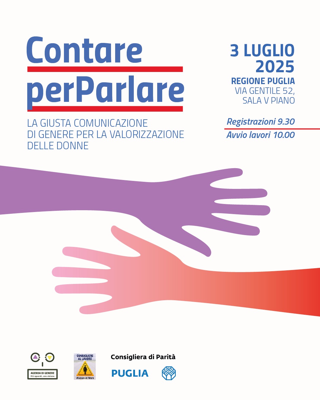 L’ufficio della Consigliera di Parità della Regione Puglia organizza l’evento formativo "Contare per Parlare - La giusta comunicazione di genere per la valorizzazione delle donne" , che si terrà giovedì 3 luglio dalle ore 9.30 nella sede della Regione Puglia di via Gentile 52 (plesso dipartimenti), sala V piano.