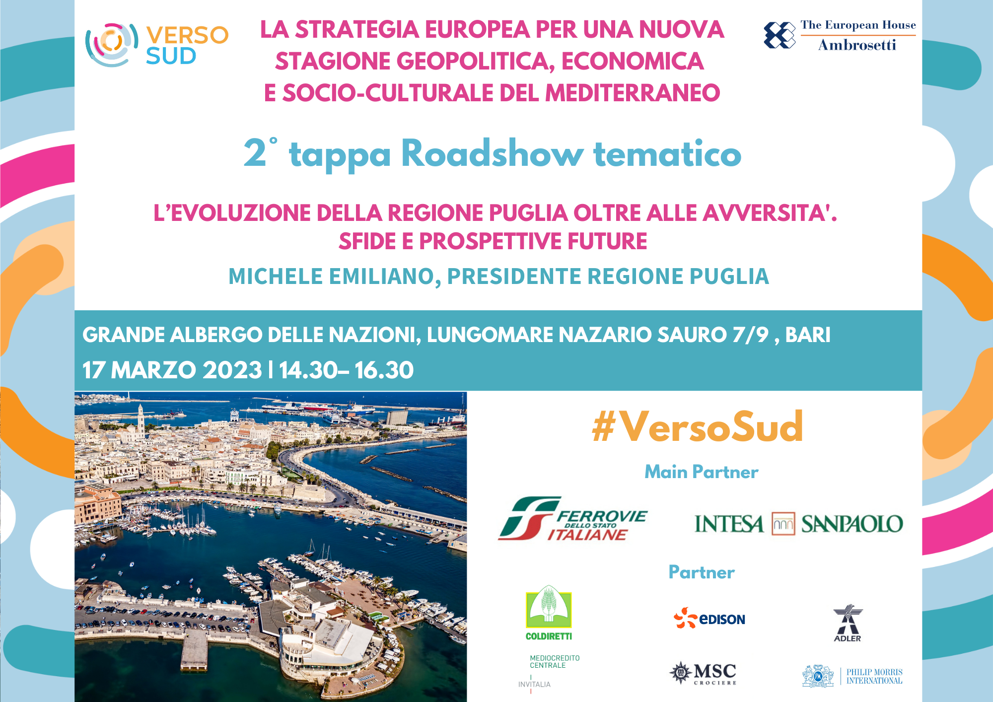 Il presidente della Regione Puglia, Michele Emiliano, parteciperà domani venerdì 17 marzo dalle ore 14.30 alla seconda tappa del roadshow territoriale organizzato da The European House – Ambrosetti per la seconda edizione del Forum “Verso Sud”.